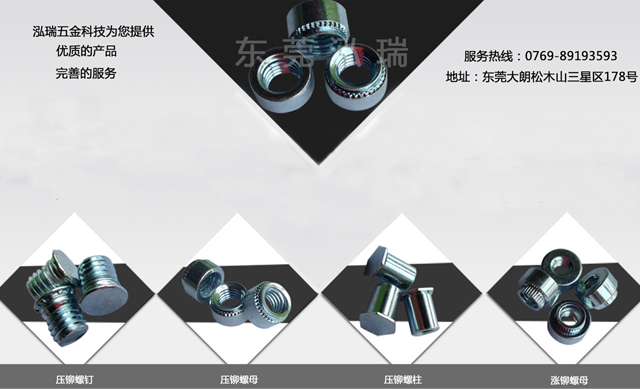 公司主要生产销售:冷镦PEM标准的压铆螺母、涨铆螺母、压铆螺柱、冷镦压铆螺柱、碳钢冷镦压铆螺母、不锈钢冷镦压铆螺母;PEM标准的压铆螺母柱,碳钢压铆螺母柱,不锈钢压铆螺母柱,铝材压铆螺母柱等标准件
